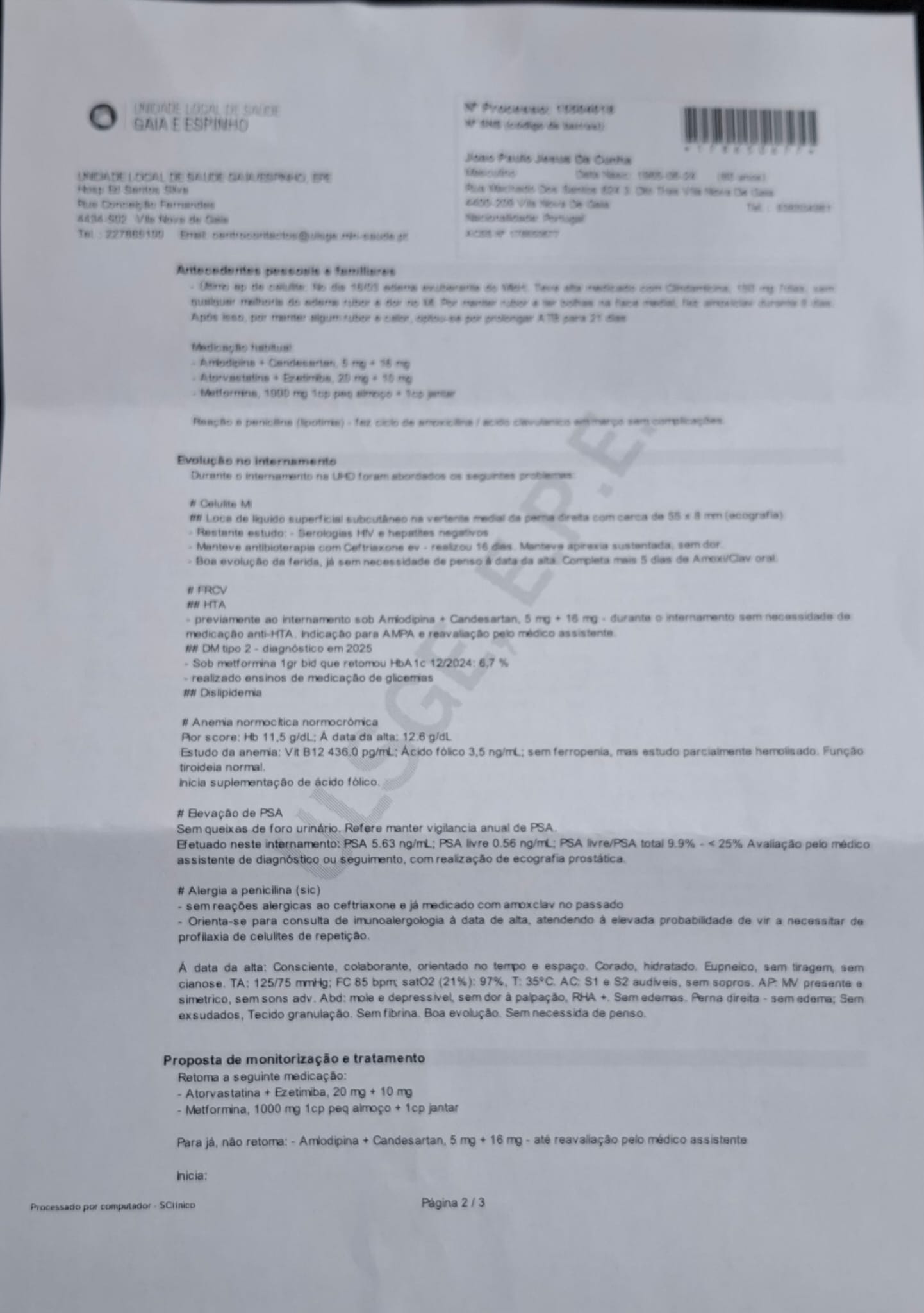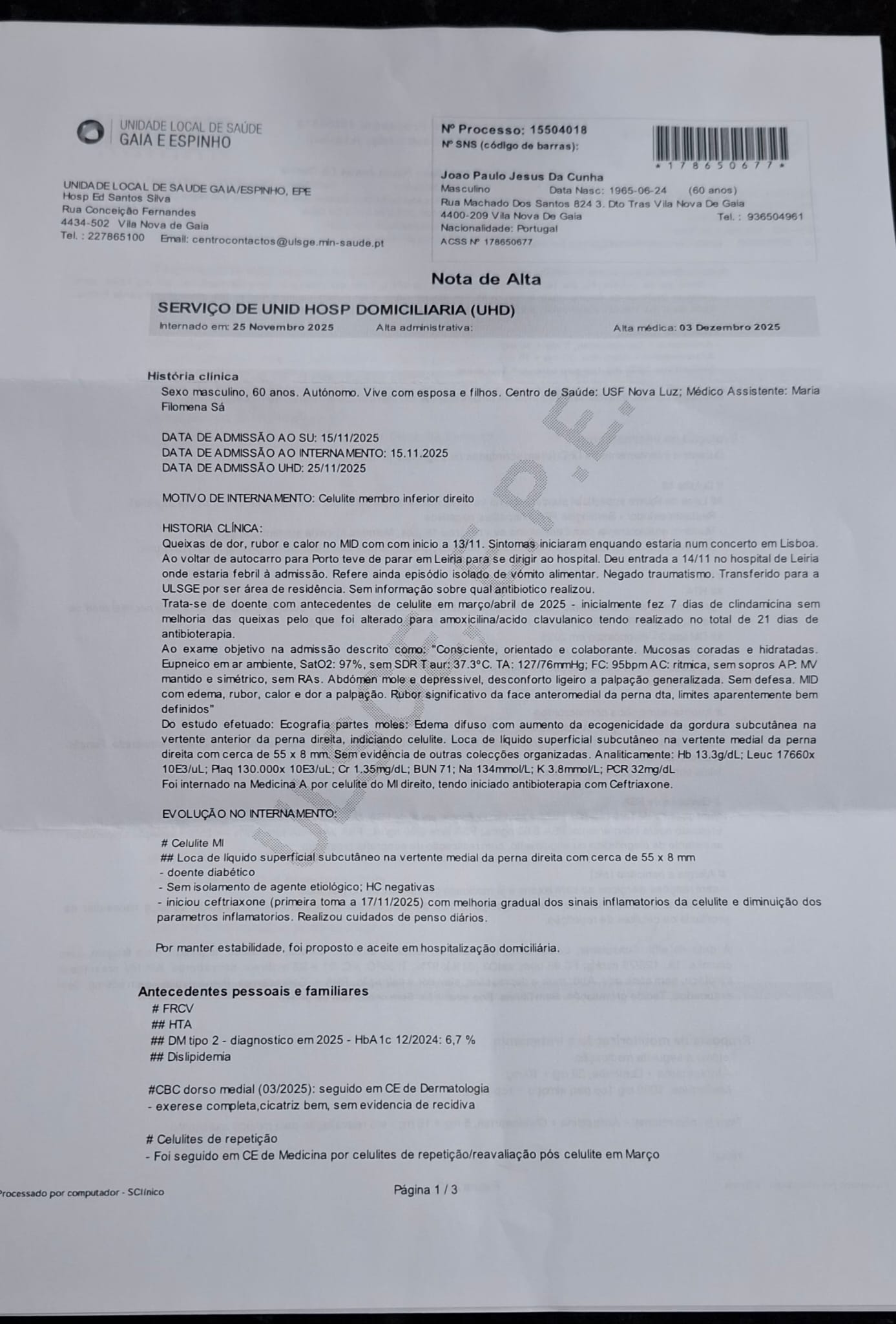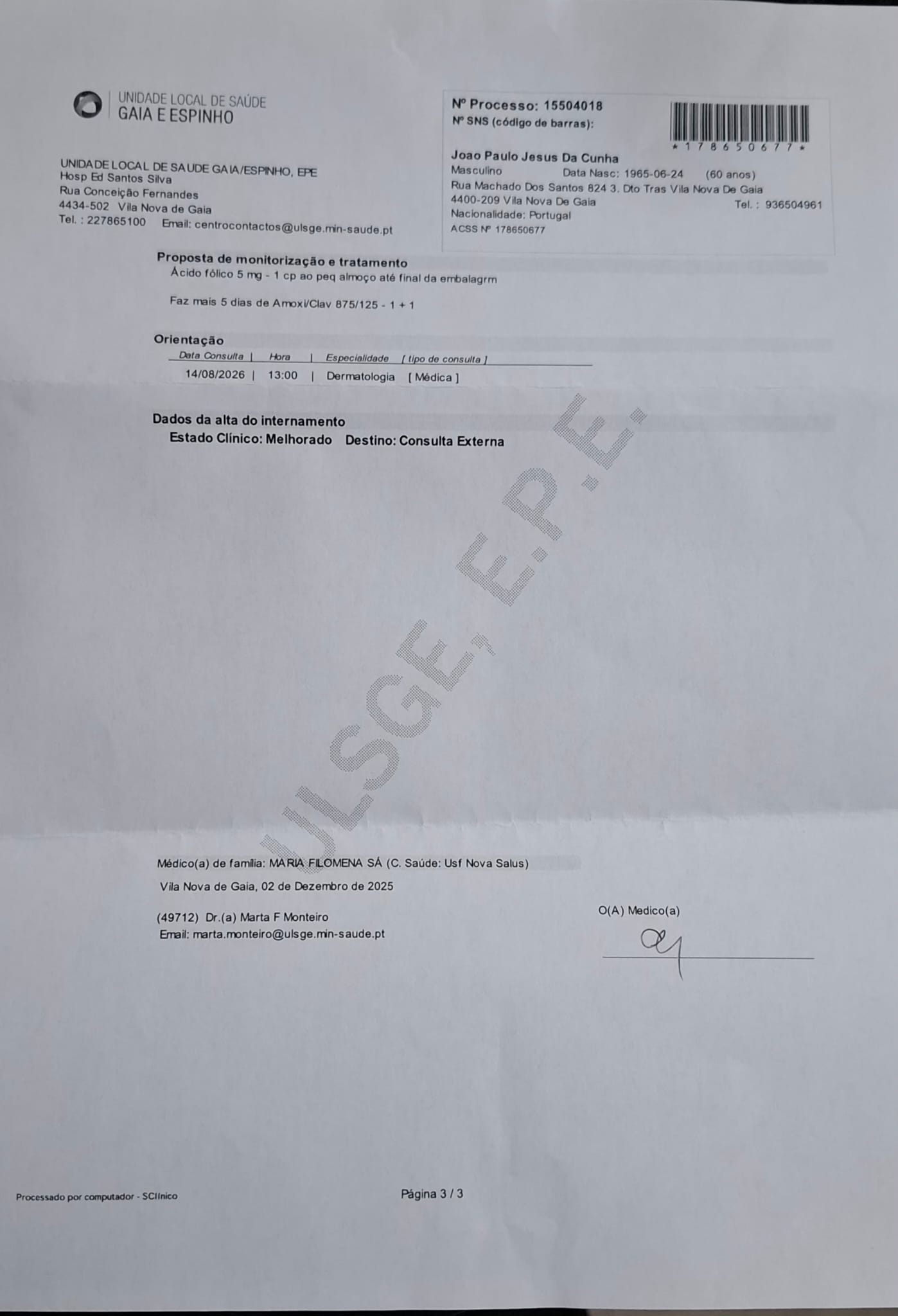 Estive internado desde o dia 14 de Novembro ate dia 3 de Dezembro , dia 4 de dezembro cerca das 9 h apresentei me no posto médico com o intuito de entregar a carta do hospital a minha medica de familia D